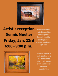 Artist-in-residence, Dennis Mueller, hosts a lovely reception. The community is invited to stroll the Hall and peruse Dennis’s beautiful paintings and enjoying wine, beer, and appetizers. 30% of the price of each painting sold is a donation to Niwot Hall, a non-profit community-centered organization.